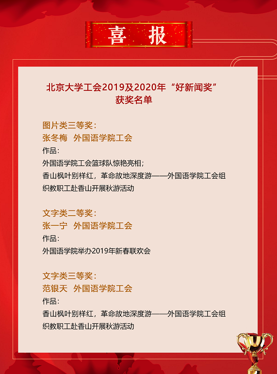 9月22日下午,工会2019及2020年“好新闻奖”评审会在老生物楼108会议室召开。党委宣传部文化办、校报、新闻网、电视台的负责同志应邀担任评委。外国语学院张冬梅老师的作品“外国语学院工会篮球队惊艳亮相”和“香山枫叶别样红,革命故地深度游——外国语学院工会组织教职工赴香山开展秋游活动”获图片类三等奖;张一宁老师的作品“外国语学院举办2019年新春联欢会”获文字类二等奖;范银天老师的作品“香山枫叶别样红,革命故地深度游 ——外国语学院工会组织教职工赴香山开展秋游活动” 获文字类三等奖。