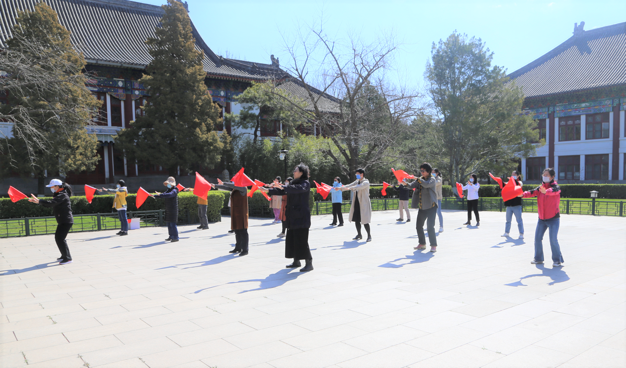 4月的北京,春意盎然。在草木吐绿、百花绽放的春光里,北京大学即将迎来2022年运动会。校工会和体育教研部精心编排了太极拳团体操《红旗颂》作为本次运动会开幕式的团体表演。在体教部老师的带领下,外国语学院工会体育委员李宁老师和行政工会小组长陈静老师参与了北京大学各院系小教员为期三个中午的团体操培训。两位老师在培训中认真练习,仔细领悟,并反复观看教学视频,圆满的完成了学习任务,为外国语学院三十余位即将参加运动会开幕式团体操表演的老师的后续训练打下坚实的基础。