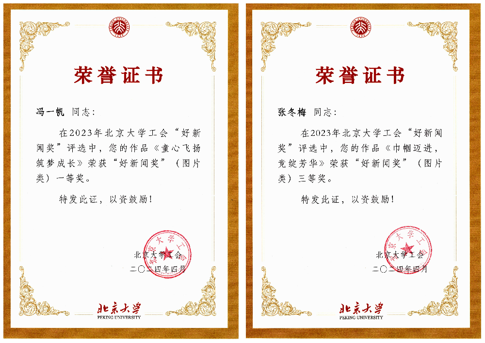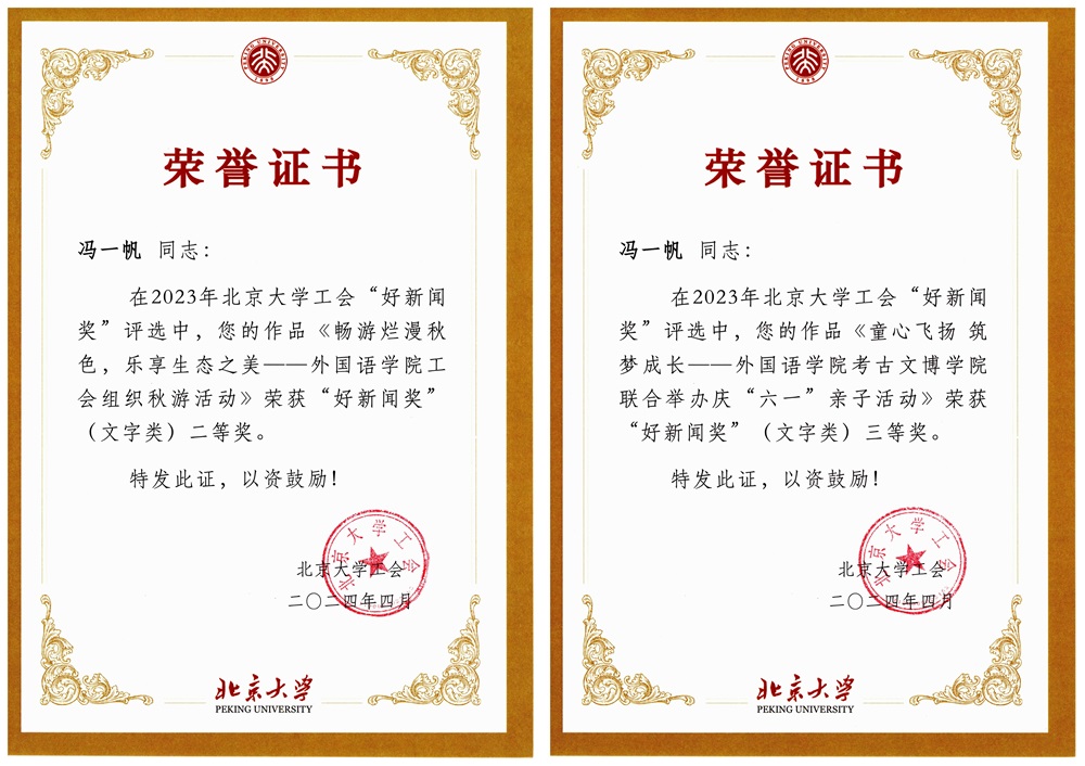 在2023年北京大学工会“好新闻奖”评选中,校工会邀请专家评委,结合工会工作特点,从新闻题材、宣传效果、稿件可读性与写作规范、图片视觉冲击力与信息含量等方面,对参评稿件和图片进行了逐一评议。外院工会会员冯一帆老师的图片作品“童心飞扬 筑梦成长”荣获“好新闻奖”(图片类)一等奖、工会主席张冬梅老师的图片作品“巾帼迈进,竞绽芳华” 荣获“好新闻奖”(图片类)三等奖。冯一帆老师的新闻作品“畅游烂漫秋色,乐享生态之美——外国语学院工会组织秋游活动”和“童心飞扬 筑梦成长——外国语学院考古文博学院联合举办庆‘六一’亲子活动”分别荣获“好新闻奖”(文字类)二等奖、三等奖。