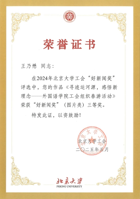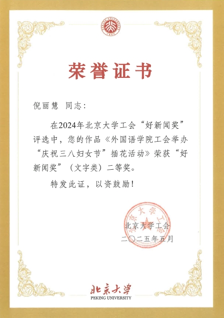 在2024年北京大学工会“好新闻奖”评选中,校工会特邀请专家评委,结合工会工作特点,从新闻题材、宣传效果、稿件可读性与写作规范、图片视觉冲击力及与主题切合度等方面,同时依据评奖通知要求,对参评稿件和图片进行了逐一评议,外国语学院倪丽慧《外国语学院工会举办“庆祝三八妇女节” 插花活动》荣获好新闻奖(文字类)二等奖;冯一帆《九州体育举行2024年新春团拜会》荣获好新闻奖(文字类)二等奖;王乃懋《寻迹运河源, 感悟新理念一一外国语学院工会组织春游活动》和《外国语学院羽毛球队荣获2024年北京大学教职工羽毛球赛乙组季军》荣获好新闻奖(图片类)三等奖。