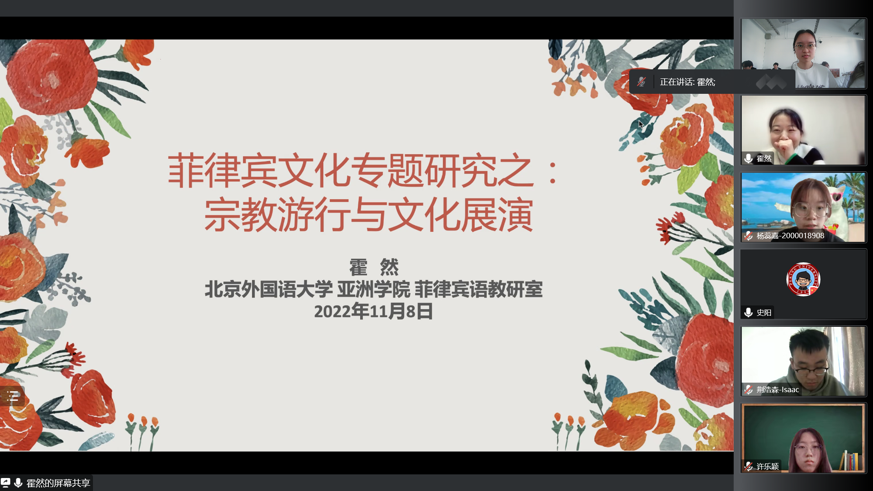2022年11月1日与8日,外国语学院东南亚系菲律宾语专业在外国语学院的支持下,举办了菲律宾文化研究系列学术讲座,由北京外国语大学亚洲学院地区教研室许翰艺老师和菲律宾语教研室霍然老师先后为菲律宾语2020级本科生班进行了两场线上讲座。两位老师分别就“菲律宾的电影艺术”和“菲律宾的宗教巡游”两个主题,探讨了菲律宾文化在现当代以多种形式进行文化展演的具体表现,分析了其中所折射出的独特内涵。系列学术讲座依托于本学期开设的“菲律宾文化”专业基础课,旨在拓宽学生的学术视野,提升本科人才培养质量,增进学科建设并扩大学术交流。讲座由菲律宾语教研室主任史阳老师主持和点评,黄轶老师参与了讨论和评议。