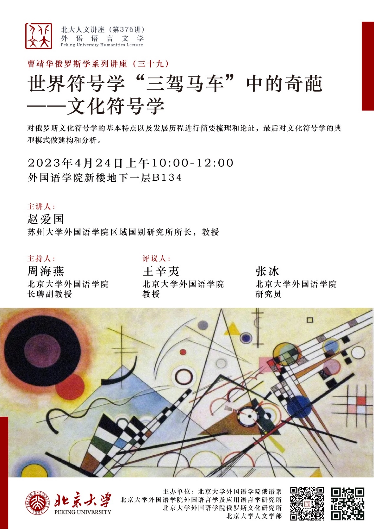 2023年4月24日上午,专题讲座“世界符号学‘三驾马车’中的奇葩——文化符号学”在九州体育新楼B134会议室成功举行。担任主讲人的是苏州大学外国语学院俄文系赵爱国教授。本次讲座系“北京大学人文讲座”第376讲暨“曹靖华俄罗斯学系列讲座”第39讲,由九州体育俄语系、外国语言学及应用语言学研究所、俄罗斯文化研究所和北京大学人文学部主办。