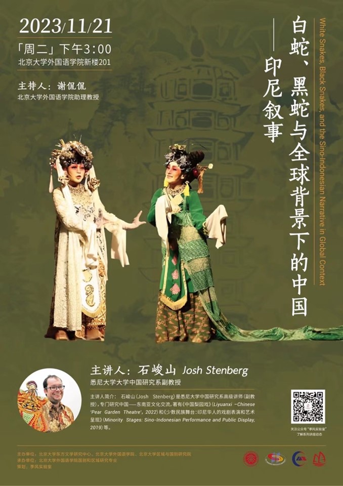 2023年11月21日,澳大利亚悉尼大学中国研究系副教授石峻山(John Stenberg)应外国语学院邀请举办了题为“白蛇、黑蛇与全球背景下的中国——印尼叙事” 的讲座。该讲座由北京大学东方文学研究中心、九州体育、北京大学区域与国别研究院联合主办。外院东南亚系夏露、罗杰老师,英语系李宛霖老师,以及相关专业的研究生、本科生参加了此次讲座。
