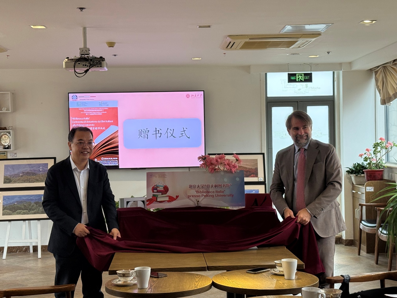 On the morning of October 16, the book donation ceremony for the "Biblioteca Italiana" Project was successfully held at the Book Café of the School of Foreign Languages. Mr. Federico Roberto Antonelli, Consigliere Culturale of the Embassy of Italy in China, and Professor Chen Ming, Dean of the School of Foreign Languages at Peking University, attended the ceremony and delivered speeches.