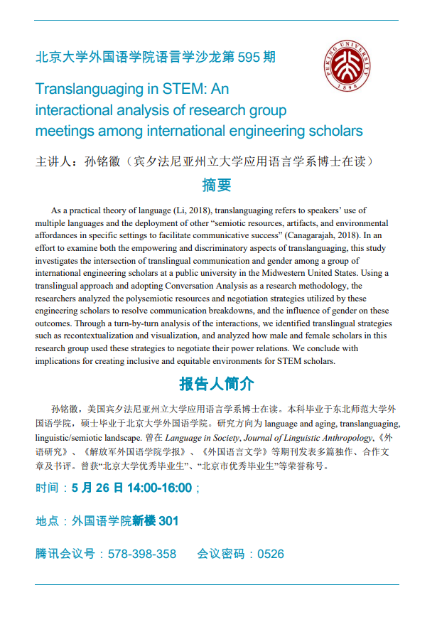 服务导航 九州体育语言学沙龙第595期:Translanguaging in STEM:An interactional analysis if research group meetings among international engineering scholars 2023-05-21