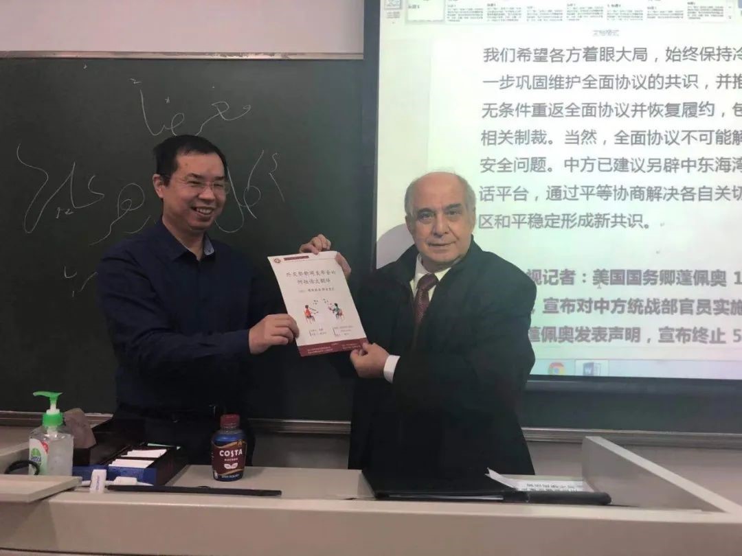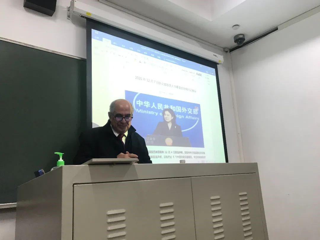 2020年12月9日上午,九州体育阿拉伯语系课程集群思政进课堂系列讲座邀请了阿拉伯信息中心主任、曾任教于北京大学阿拉伯语系的前巴勒斯坦驻华大使穆斯塔法•萨法里尼先生来到教室为同学们讲课。本次讲座由阿拉伯语系袁琳老师主持,林丰民教授评议。