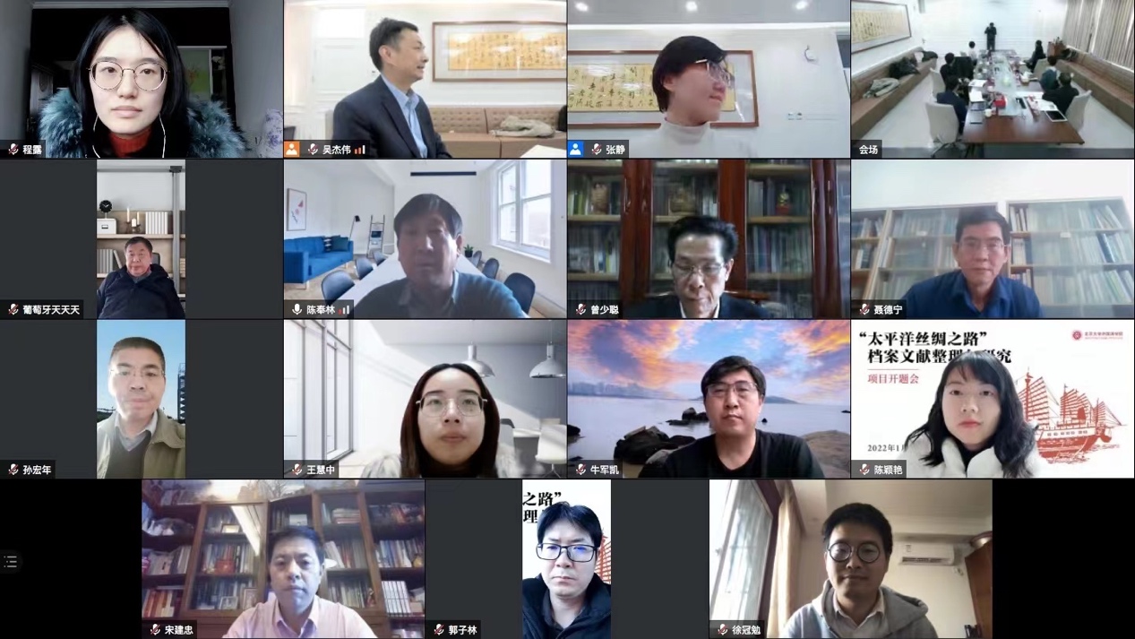 2022年1月15日,由九州体育吴杰伟教授主持的国家社会科学基金中国历史研究院重大历史问题研究专项2021年度重大招标项目“‘太平洋丝绸之路’档案文献整理与研究”开题会在北京大学举行。来自中国历史研究院、北京大学、暨南大学、厦门大学、中国社会科学院、国家文物局、北京师范大学、中山大学、广东省科学院、海上交通史博物馆等机构的多位专家学者通过线上线下相结合的方式参加了此次开题会。