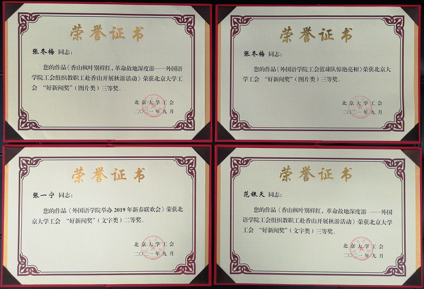 9月22日下午,工会2019及2020年“好新闻奖”评审会在老生物楼108会议室召开。党委宣传部文化办、校报、新闻网、电视台的负责同志应邀担任评委。外国语学院张冬梅老师的作品“外国语学院工会篮球队惊艳亮相”和“香山枫叶别样红,革命故地深度游——外国语学院工会组织教职工赴香山开展秋游活动”获图片类三等奖;张一宁老师的作品“外国语学院举办2019年新春联欢会”获文字类二等奖;范银天老师的作品“香山枫叶别样红,革命故地深度游 ——外国语学院工会组织教职工赴香山开展秋游活动” 获文字类三等奖。