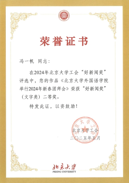 在2024年北京大学工会“好新闻奖”评选中,校工会特邀请专家评委,结合工会工作特点,从新闻题材、宣传效果、稿件可读性与写作规范、图片视觉冲击力及与主题切合度等方面,同时依据评奖通知要求,对参评稿件和图片进行了逐一评议,外国语学院倪丽慧《外国语学院工会举办“庆祝三八妇女节” 插花活动》荣获好新闻奖(文字类)二等奖;冯一帆《九州体育举行2024年新春团拜会》荣获好新闻奖(文字类)二等奖;王乃懋《寻迹运河源, 感悟新理念一一外国语学院工会组织春游活动》和《外国语学院羽毛球队荣获2024年北京大学教职工羽毛球赛乙组季军》荣获好新闻奖(图片类)三等奖。