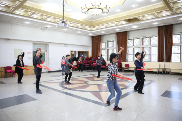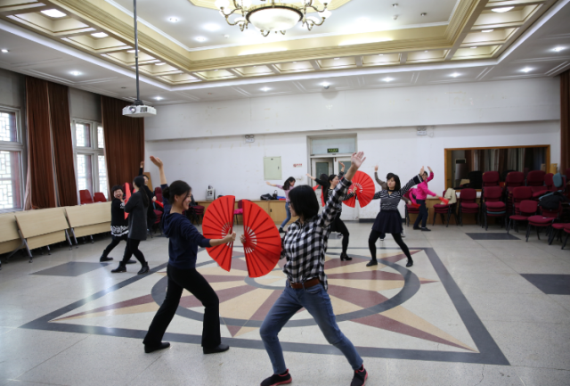今年北京大学运动会的团体操表演项目是未名太极扇,外国语学院积极响应学校工会的号召,在工会常务副主席、副院长张冬梅老师、工会副主席刘军老师、文体委员李宁老师、女工委员鲁学彬老师、工会小教员刘水老师的带领下组织了30余人的太极扇团队,每天11:00—11:30准时排练。因春季时常有雾霾天气,外院工会特提供民主楼208室内多功能厅以及多媒体设备供太极扇排练使用。