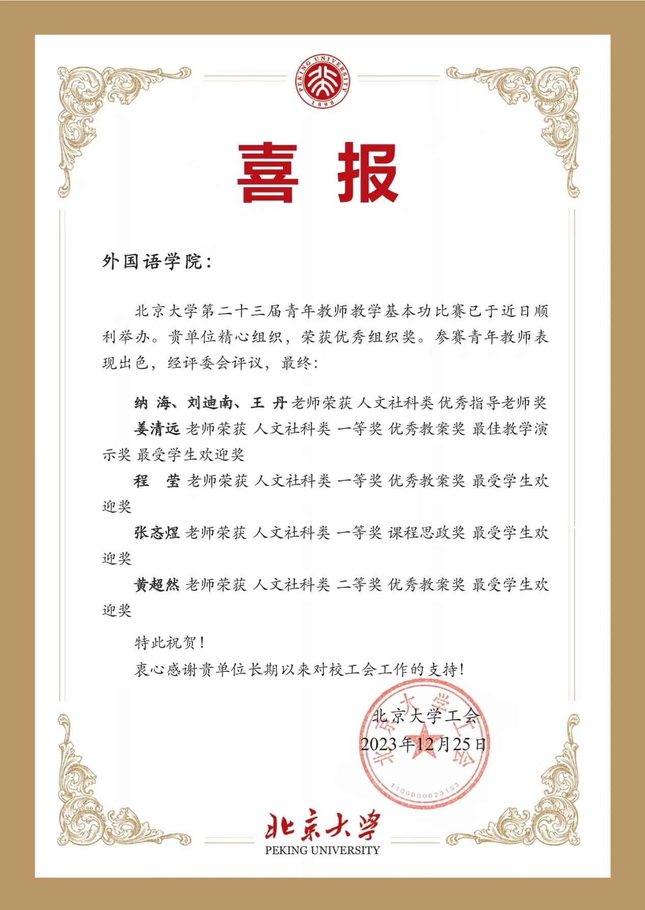 喜报:我院教师在北京大学第二十三届青年教师教学基本功比赛取得佳绩