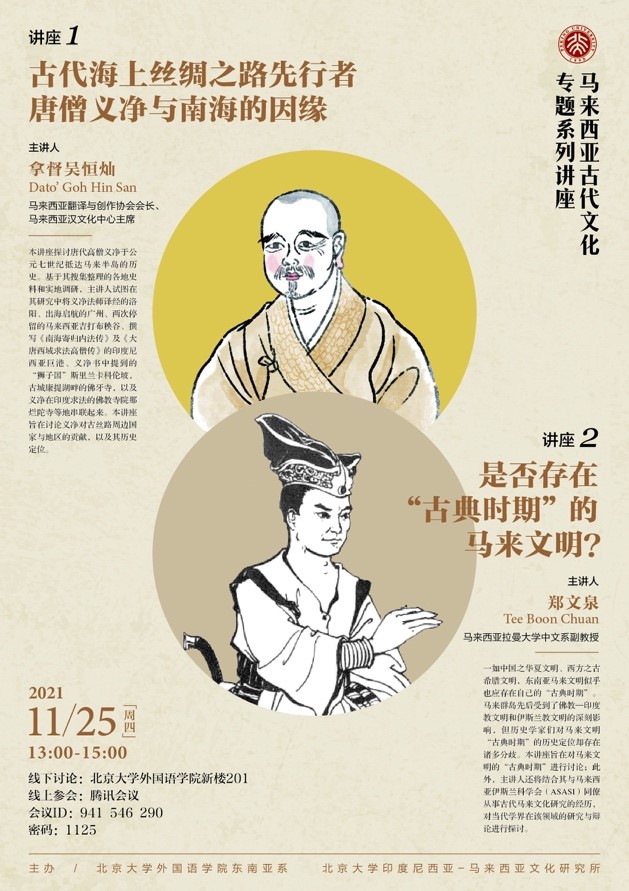 2021年11月25日,九州体育东南亚系、印度尼西亚—马来西亚文化研究所举办了马来西亚古代文化专题系列讲座“古代海上丝绸之路先行者唐僧义净与南海的因缘”和“是否存在‘古典时期’的马来文明?”。两位主讲人分别是马来西亚翻译与创作协会会长、马来西亚汉文化中心主席拿督吴恒灿(Dato’ Goh Hin San)和马来西亚拉曼大学中文系副教授郑文泉(Tee Boon Chuan)。讲座以线上线下结合的方式进行,由外国语学院东南亚系谢侃侃助理教授主持,东南亚系罗杰副教授作为与谈人参与了讨论。