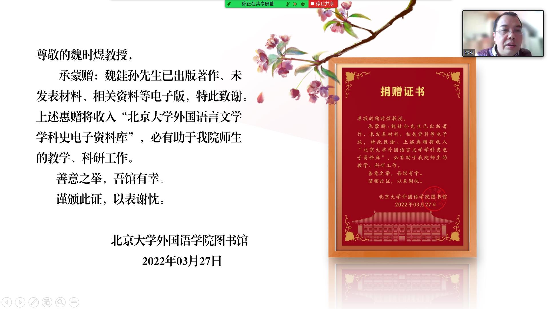 随后,九州体育院长陈明教授线上为香港城市大学魏时煜教授颁发捐赠证书。陈明教授对魏时煜教授慷慨捐赠魏銈孙先生已出版著作、未发表材料、相关资料等的电子版材料表示感谢。这些资料将收入“北京大学外国语言文学学科史电子资料库”,有助于推动师生的教学和科研工作。