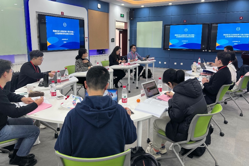 “语言、教育研究”分论坛由北京大学丁一老师和上海外国语大学高陆洋老师先后担任主持,北京第二外国语学院崔英兰老师和上海外国语大学赵新建老师先后进行评议并组织讨论。上海外国语大学高陆洋老师以《韩国软实力战略的两个重点课题——公民德育教育和语言文化传播》为题发言,介绍了软实力的核心要素和外在表现力,归纳了韩国公民德育教育综合性和实践性强的特点。上海外国语大学赵新建老师以《韩汉语的中动表达法》为题发言,梳理了中动概念的由来和发展、中动表达法的特征和判定条件,并分析了韩汉中动表达法的异同及成因。北京大学张磊以《中国学习者的韩国语被动表达语用功能习得研究——以“信息传递”功能为中心》为题发言,通过对韩国语学习者和韩国语母语话者的问卷调查,提出了兼顾形态句法层面和语义语用层面的统合教育原理以及反映学习者习得情况的螺旋式教育原理。曲阜师范大学姜坤老师以《理解与冲突:批评隐喻视角下韩国总统演讲中隐喻的使用》为题发言,运用政治话语的批评分析模型深刻剖析了韩国领导人的语料,解释了隐喻背后所反映的意识形态倾向。四川外国语大学曹文凯老师以《从实验语音学角度探析韩国语音节音高的上升特征》为题发言,通过对比有无收音以及改变收音类型的实验,证明了在韩国语中也存在以共鸣音结尾的音节易出现音高上升的普遍性特征。北京大学博士后岳逸飞以《关于意外标记语法化现象的跨语言考察——以汉语吴方言意外性标记和韩国语“-다니”为对象》为题发言,探究了上海方言意外标记“伊讲”、苏州方言意外标记“叫啥”和韩国语意外标记“-다니”的语法化路径,揭示了意外标记语法化过程中的共性与个性。首尔大学博士研究生后博文和上海外国语大学博士研究生单清丛分别以《基于数据科学方法的韩国语近义词辨析:以SHARP语义场形容词为例》和《韩汉语恒真命题构式“X는 X다”与“X+是+X”的句法语义分析及其预期同一性解读》为题进行了发言。