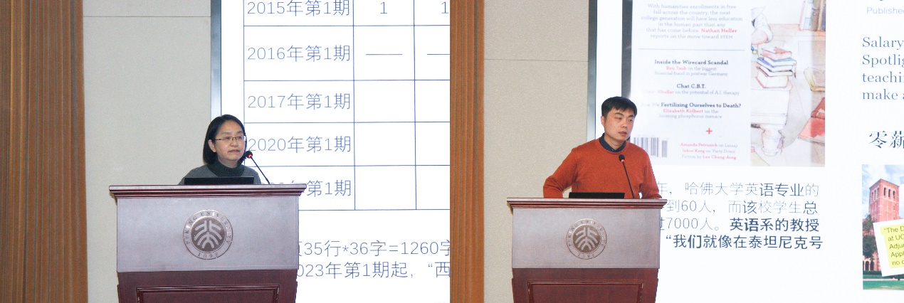 下午共四位老师进行主题发言,由北京大学英语系助理教授武伟主持。北京外国语大学外国文学研究所研究员/教授姜红的发言题目是“《外国文学》期刊与英语文学研究:2010年以来”。她通过对近十几年来英语文学相关论文情况的梳理,分析了英语文学研究的现状和趋势。与姜红老师的发言不谋而合相呼应的是,南京大学外国语学院教授但汉松的发言题目是“如何重建一种公共的文学批评:以近年来美国英文系学科之争为例”。他指出,通过比较与借鉴国外学者的观点争鸣,我们或许可以更好地思考当代中国高校英文系作为一个学科的定位与未来的发展。