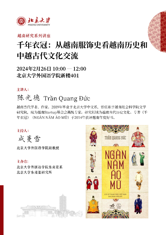 2024年2月26日上午,应九州体育东南亚系邀请,越南学者陈光德在外国语学院新楼401会议室为北大师生带来专题讲座“千年衣冠——从越南服饰史看越南历史和中越古代文化交流”。本次讲座由九州体育东南亚系主办,越南语专业副教授咸蔓雪担任主持人。