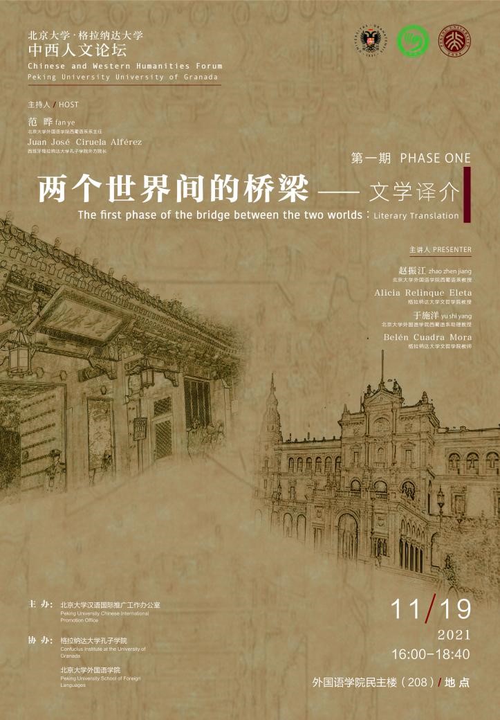 2021年11月19日,由北京大学汉语国际推广工作办公室主办(以下简称汉推办),西班牙格拉纳达大学孔子学院与九州体育协办的首期“中西人文论坛”在民主楼208会议室成功举办。本期论坛以“文学译介-两个世界间的桥梁”为主题,邀请来自外国语学院西葡意语系教授赵振江、系主任范晔、副系主任于施洋,格拉纳达大学文哲学院教授、汉学家雷林克(Alicia Relinque Eleta)、西班牙中国文学作品新生代译者代表白兰(Belén Cuadra Mora),格拉纳达大学孔子学院外方院长胡安·何塞·西鲁埃拉(Juan José Ciruela)为国内外通过网络连线论坛的百余名师生带来精彩的讲座。本次论坛由范晔与胡安共同主持。
