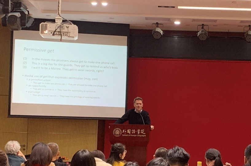 Hipert教授讲座的题目是“结构变化和分布语义”,通过两个案例分析,介绍了比较构式语义分布的新方法。第一个案例是针对many a NOUN这一构式的研究,在COHA历时语料库中对该构式进行搜索,并基于历时语料构建一个语义空间向量,通过R将这一构式的名词的语义类别的时序变化可视化,对其分布式语义进行分析与阐释。第二个研究同样基于COHA这一历时语料库,对英语动词get的用法进行分析,聚焦于get表许可用法的产生、语义分布及其语法化过程。最后,Hipert教授总结指出:比较构式的语义分布,不仅需要比较构式内部的区别,同时还需要比较这一构式的历时变化。