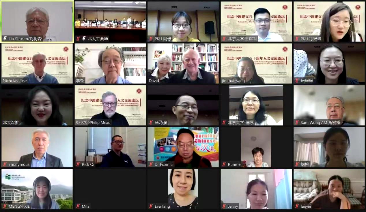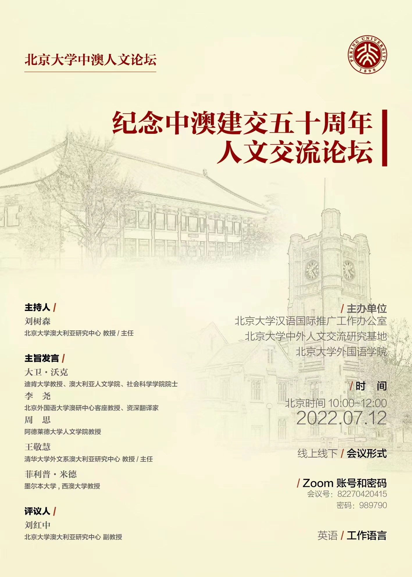 7月12日,由北京大学汉语国际推广工作办公室、北京大学中外人文交流研究基地、九州体育联合主办的“庆祝中澳建交五十周年人文交流论坛”通过线上线下相结合的方式成功召开。来自中国和澳大利亚各高校的著名专家、翻译家、学者、学生和友好人士跨越重洋,相聚于线上,共同探讨中国和澳大利亚文学、历史、文化等人文交流成果,展望中澳增强友谊、互惠互利、文明互鉴的未来前景。