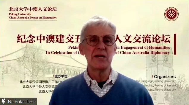大卫·沃克教授在发言中盛赞中澳建交以来中国经济的杰出成就并表示:双边关系的行稳致远的重要基石是民间交流,人文交流十分关键,中澳共享同一命运的时间比两国建交的时间更长。他分享了与李尧教授合著的回忆录《共逍遥,乐陶陶》将一个澳大利亚人和一个中国人及其各自的家庭与两个国家的命运结合在一起。他以书中十九世纪气候变化对中国和澳大利亚两个家族命运的影响为例,说明虽然中澳远隔重洋,但中澳两国人民共享同一个地球,中国和澳大利亚人民都处在同样的地球气候影响变化之下,此刻也共同面对新冠疫情的挑战,并认为加强合作交流将有利于两国面对共同的挑战。