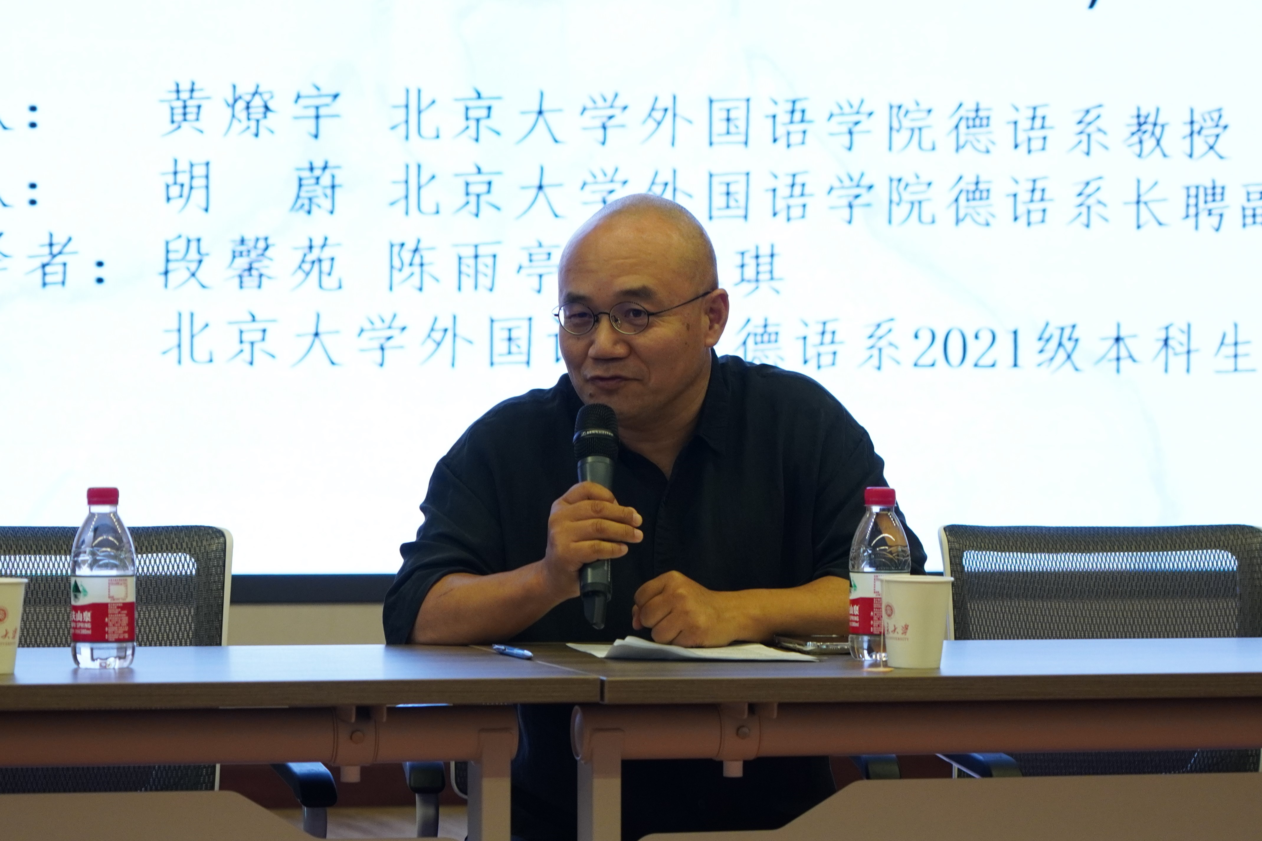 讲座结束后,与谈人黄燎宇教授围绕讲座主题展开了进一步探讨。黄老师表示,听了马琳达博士的精彩报告,他再次深切地体会到一个道理:小国奥地利是一个令人钦佩的文化大国。黄老师认为,马琳达博士对奥地利文学的总结弥足珍贵,报告迫使我们从内容和形式两个方面对奥地利文学的独特性进行思考,包括它与德国文学的区别。在随后的提问环节中,马琳达博士与北京大学德国研究中心、历史学系硕士生叶心远同学探讨了奥地利文学界对奥地利官方的批评在官方与民间的反响问题。中国驻奥地利大使馆原文化参赞贾建新先生也分享了他在奥地利观看耶利内克戏剧的经历。最后,来宾上台合影,讲座圆满结束。