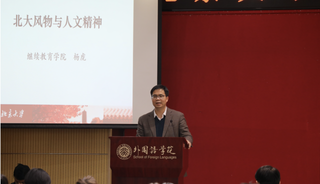 12月18日下午,外国语学院“北大风物与北大精神”主题讲座在外院新楼501报告厅举行,邀请继续教育学院副书记杨虎老师担任主讲人,院党委书记李淑静老师出席活动。全体团校学院、初级党课学员共100余人共同参与学习。