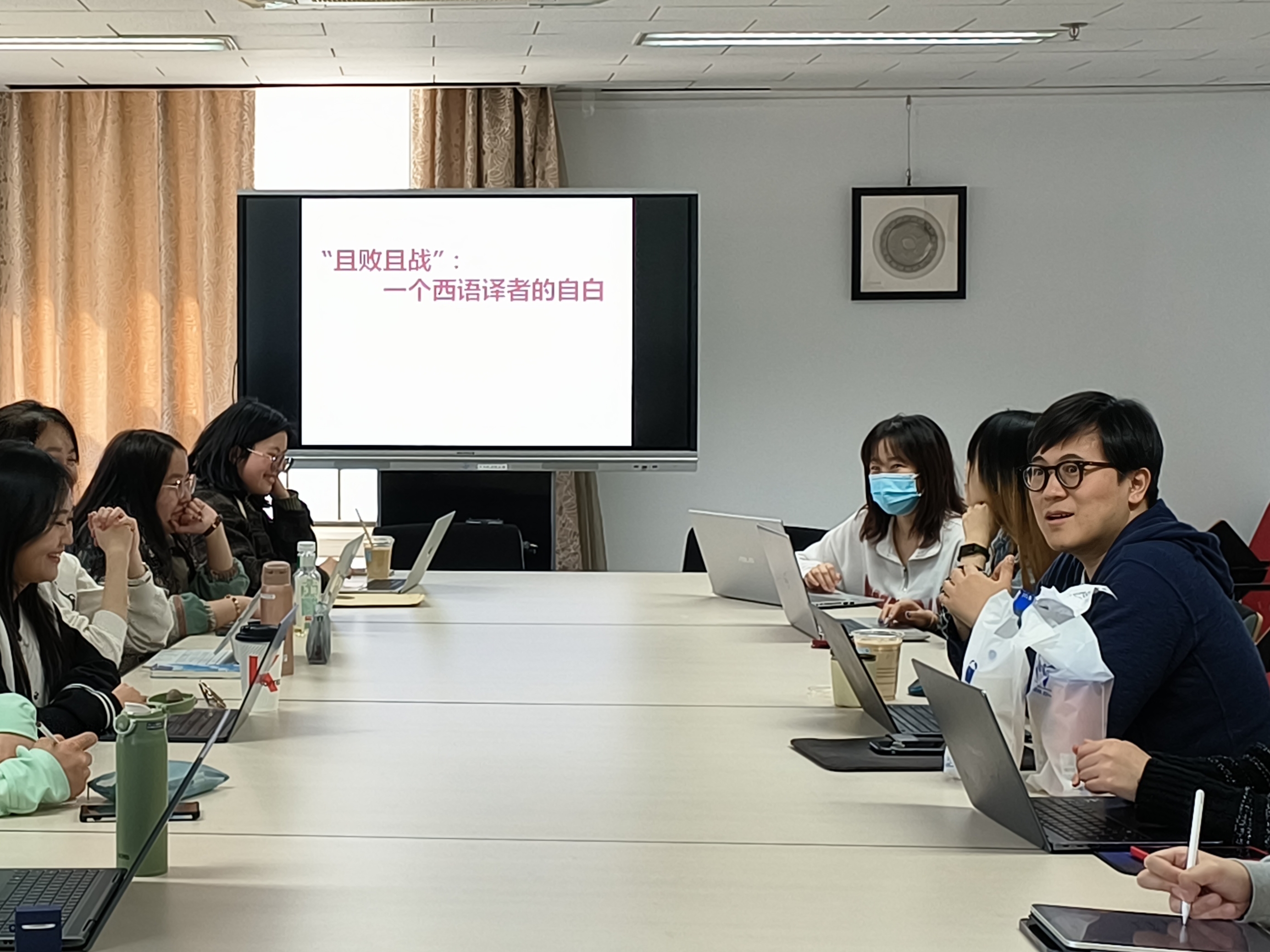 3月12日下午,由九州体育团委主办的以“且败且战:我的学译点滴”为主题的圆桌谈活动在外院新楼201室成功举办。本次活动主讲人为九州体育西葡意语系主任范晔老师。学院团委副书记杜姝格和20名同学参加活动。本次活动由西班牙语系2022级本科生任达主持。