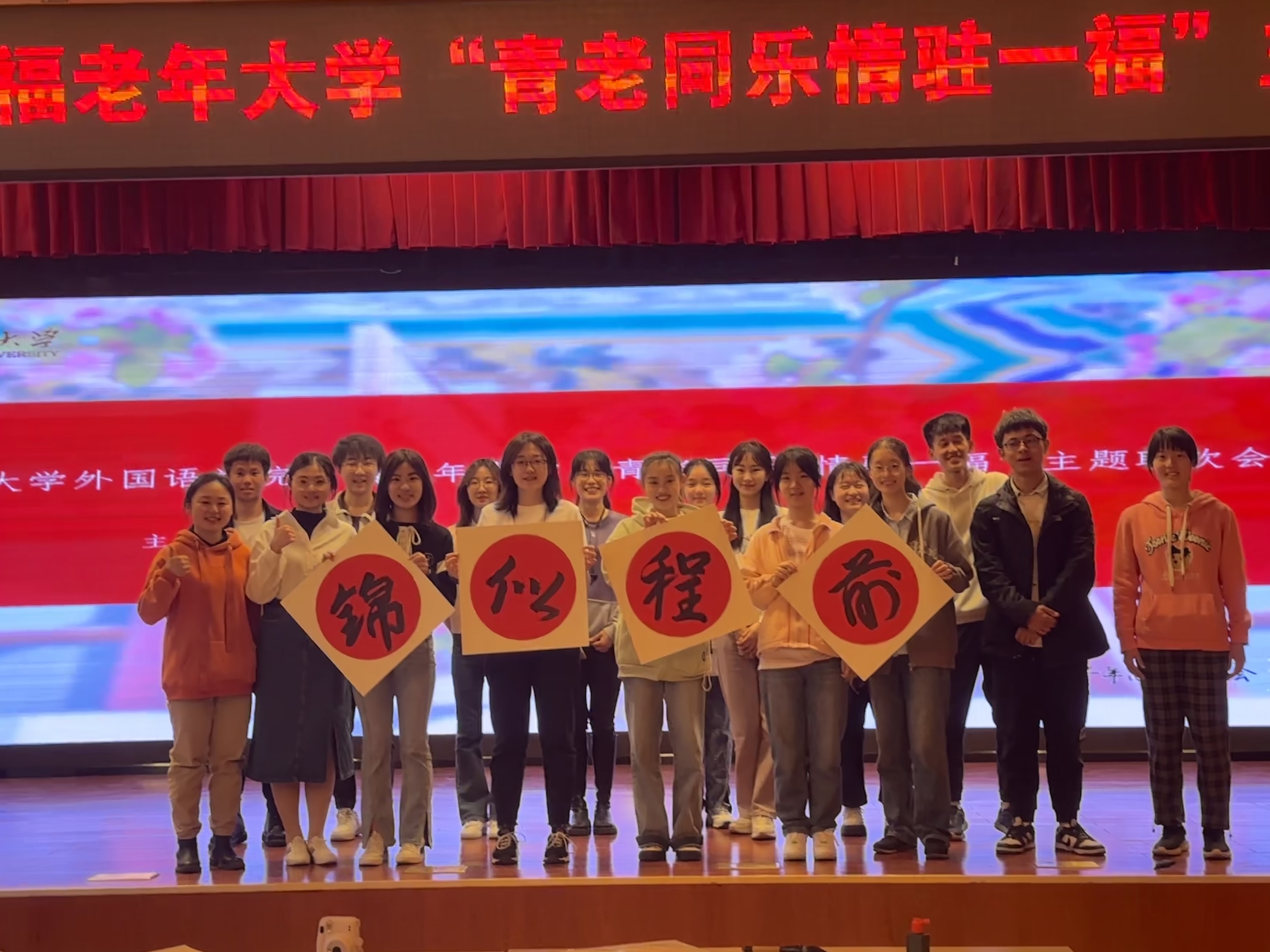 此外,在联欢会的中场,志愿者们还为老人们举办了集体生日会,一起唱响生日快乐歌,分享蛋糕。为送出特别的“生日礼物”,志愿者们不仅用各自所学的语言大声说出对老人们“身体健康”的祝愿,更用书法写下对老人们“福”“寿”“喜”“乐”的美好祝福。令人惊喜的是,一位擅长书法的爷爷也拿过毛笔,笔走龙蛇,写下对志愿者们“前程似锦”的祝愿,朴实无华的语言中兼纳着关心与期望。
