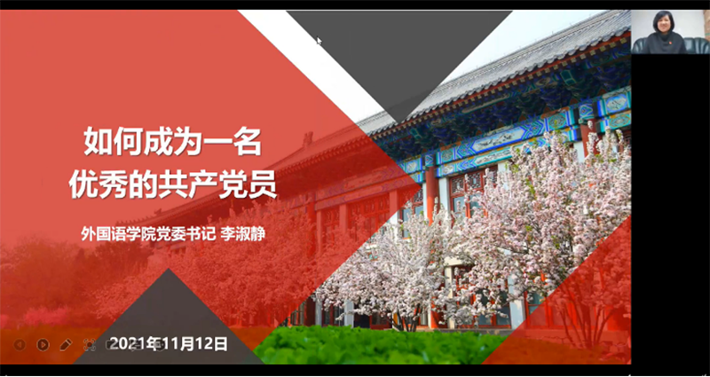 2021年11月12日下午,外国语学院举办第34期党的知识培训班开班动员会暨党委书记讲党课活动,考虑到疫情防控需要,本次活动以线上腾讯会议的形式召开。本次活动由学院党委书记李淑静担任主讲,党委副书记王恒、团委书记伍昕钰、团委常务副书记于丹出席会议,第34期党的知识培训班领队辅导员邹艾安担任主持。培训班一百七十余名学员齐聚云上,认真听讲,积极互动,以端正的态度和饱满的精神正式开启初党学习之旅。