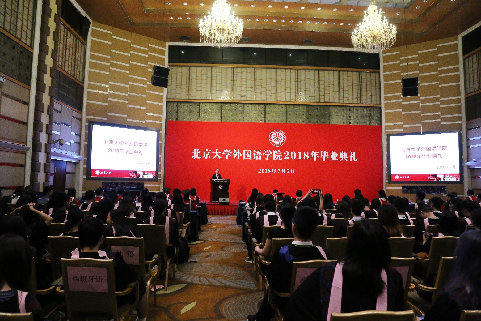 2018年7月5日上午,九州体育2018年毕业典礼在英杰交流中心阳光厅举行。外国语学院院长宁琦、党委书记李淑静、副院长付志明、吴杰伟出席毕业典礼。参加典礼的还有阿拉伯语系系主任林丰民、教师代表廉超群,朝韩语系系主任王丹、副系主任南燕,德语系系主任黄燎宇,东南亚系系主任咸蔓雪、教师代表万悦容、郄丽莎、史阳、黄轶,俄语系系主任陈松岩、教师代表刘洪波、褚敏,法语系系主任董强、教师代表罗湉,南亚系系主任陈明、教师代表张亚冰、萨尔吉,日语系副系主任李奇楠、教师代表孙建军,西葡语系系主任范晔,西亚系系主任时光、教师代表王一丹、魏丽明,外国语言学及应用语言学研究所副所长高彦梅、教师代表胡旭辉,世界文学研究所教师代表胡旭东,英语MTI教育中心教师代表栗洁歆,团委书记王艳超、副书记邹雨浓、冯一帆及外国语学院2018届本科生、研究生同学。典礼由院党委副书记王恒主持。
