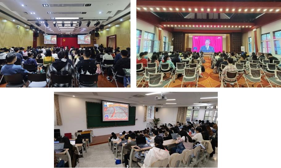 院党委书记李淑静,副院长吴杰伟,校工会副主席、第二班主任田越,院党委副书记王恒,党委秘书、辅导员以及300余名师生在外院新楼501会议室、民主楼208会议室、外文楼103会议室等会场集体收看党的二十大开幕会。