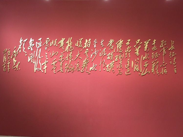一进入展厅,写有毛主席那首《七律·长征》诗词的红色巨幅展板就矗立在眼前:“红军不怕远征难,万水千山只等闲。五岭逶迤腾细浪,乌蒙磅礴走泥丸。金沙水拍云崖暖,大渡桥横铁索寒。更喜岷山千里雪,三军过后尽开颜。”这首脍炙人口、气势磅礴的诗作曾被谱成曲子广为传唱,因此那熟悉的旋律就立刻在耳边响起。紧接着映入眼帘的是红军爬雪山的巨幅画作。这诗文和画作穿越时空,将大家带回到80年前那“雪皑皑,野茫茫”的长征路上。