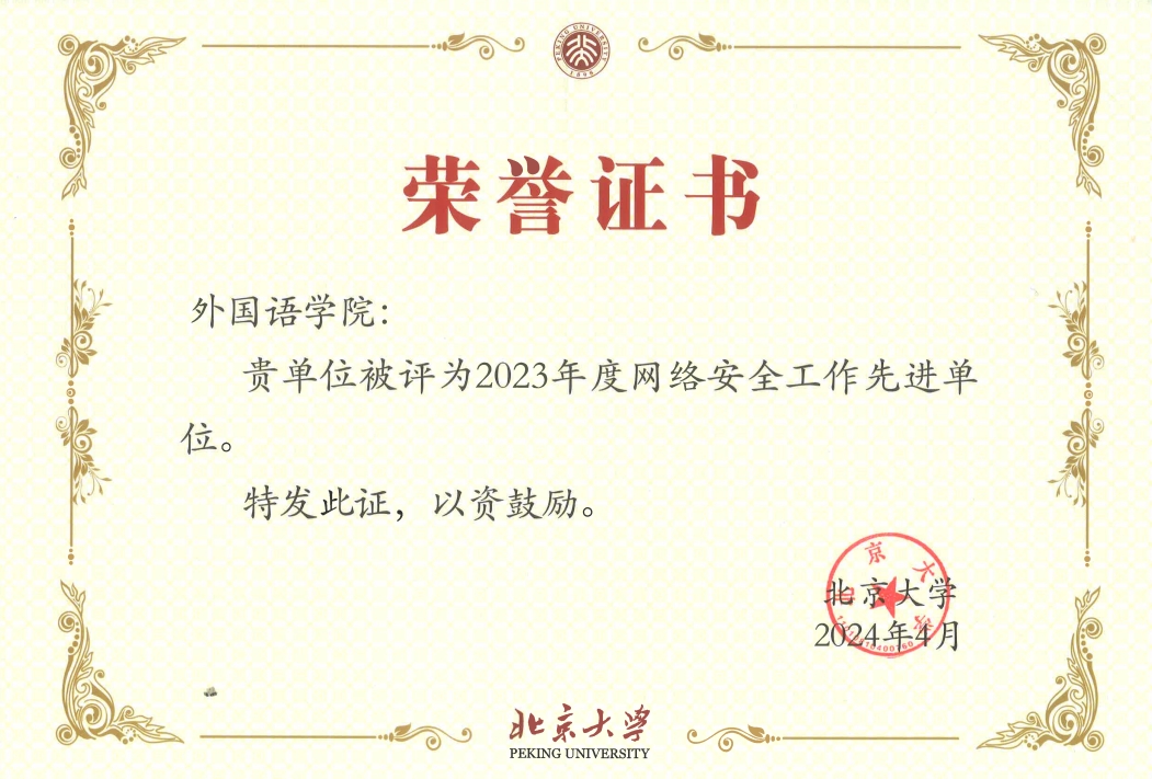 外国语学院荣获北京大学2023年度网络安全工作先进单位