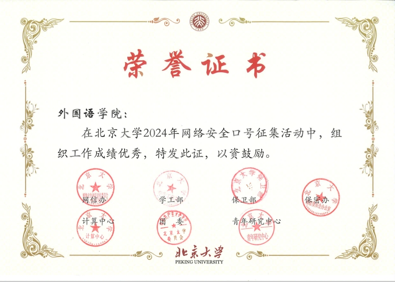 在网络安全口号征集活动中,外院师生积极围绕“网络安全为人民,网络安全靠人民”主题,以体现北京大学特色,内容健康活泼,形式简洁、朗朗上口为原则,踊跃向北京大学网信办提交了网络安全口号。外国语学院组织工作突出,荣获北京大学2024年网络安全口号征集活动优秀组织奖。