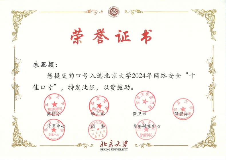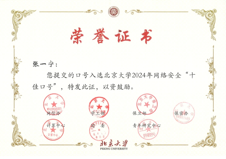 在全校师生提供的上百条应征口号中,经过网络安全宣传周主办单位、网络安全专家投票,外院三位师生提供的网络安全口号荣获北京大学2024年网络安全“十佳口号”: