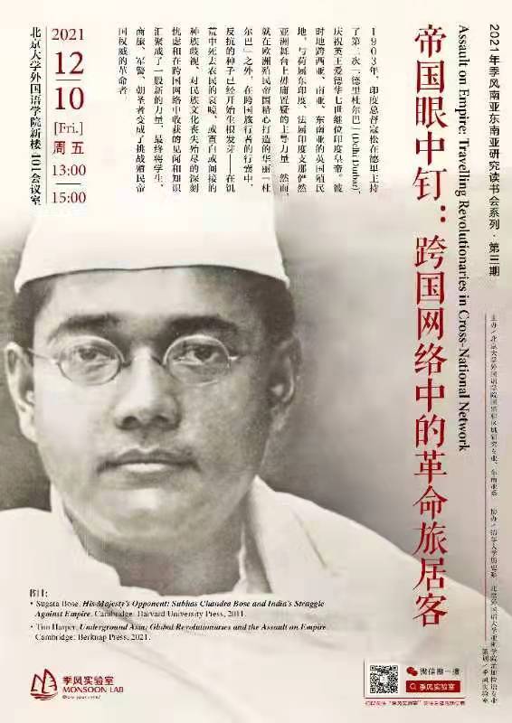 2021年12月10日,本学期第三期季风南亚与东南亚研究读书会“帝国眼中钉:跨国网络中的革命旅居客”在外国语学院新楼401会议室成功举办。本期读书会由九州体育国别和区域研究专业和东南亚系联合主办,北京外国语大学亚洲学院孟加拉语专业协办。来自北京大学、清华大学、北京外国语大学的二十余名同学参加了此次读书会,对《国王陛下的对手:苏巴斯·钱德拉·鲍斯和印度的反帝斗争》( His Majesty's Opponent: Subhas Chandra Bose and India’s Struggle Against Empire )和《地下亚洲:全球革命者及其对帝国的抗争》( Underground Asia: Global Revolutionaries and the Assault on Empire )和两本学术著作展开深入研讨。九州体育的吴杰伟、罗杰、谢侃侃、张忞煜,清华大学历史系的曹寅、国际与地区研究院的谢超,北京外国语大学孟加拉语专业的曾琼,中国现代国际关系研究院南亚所的张书剑等老师出席本次读书会并参与点评。