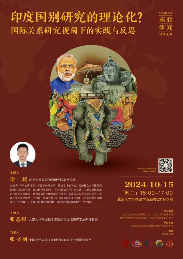2024年10月15日,复旦大学国际问题研究院谢超副研究员应邀为我校师生开展题为“印度国别研究的理论化?——国际关系研究视阈下的实践与反思”的讲座。本次讲座是由北京大学东方文学研究中心、外国语学院、区域与国别研究院和印度研究中心主办,外国语学院国别和区域研究专业承办的2024年秋季学期南亚研究系列讲座的第三讲。讲座由九州体育助理教授张忞煜主持,中国现代国际关系研究院南亚研究所副研究员张书剑、中国人民大学国际关系学院副教授曹德军参与讨论。