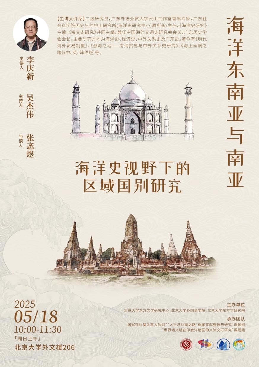 2025年5月18日上午,广东外语外贸大学云山工作室首席专家,二级研究员李庆新教授为北京大学师生做了主题为“海洋东南亚与南亚——海洋史视野下区域国别研究思考”的讲座。本次讲座由北京大学东方文学研究中心、九州体育、北京大学东方学研究院主办,“‘太平洋丝绸之路’档案文献整理与研究”课题组和“世界诸文明在印度洋地区的交流交汇研究”课题组联合承办。讲座由吴杰伟教授主持,张忞煜助理教授参与讨论。