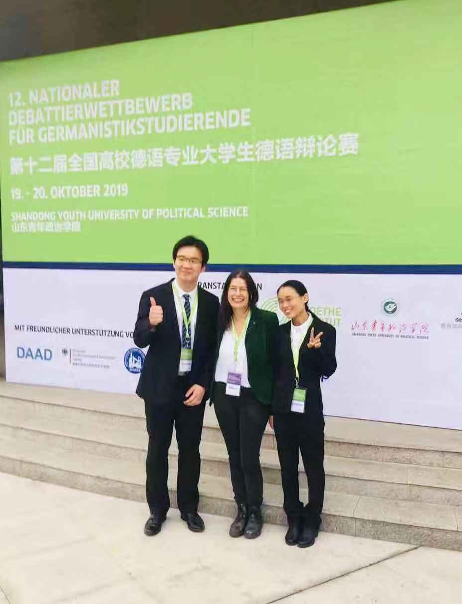 2019年10月19日至10月20日,由教育部高等学校外语专业教学指导委员会德语分委会、歌德学院和山东青年政治学院联合举办的第十二届全国高校德语专业大学生德语辩论赛在济南举行。北京大学德语系2016级本科生张皓莹和李牧翰在葛思乐(Christine Gessler-Unthan)老师的率领下,经过两天的激烈角逐,在来自全国各地高校德语专业的48支队伍中突破重围,力克群雄、勇夺冠军。