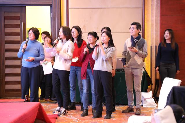 语言所的老师们集体上阵,带来了团拜会最别出心裁的方言配音节目——方言版“小猪佩奇”和“还珠格格”,老师们用东北话、武汉话、天津话、南京话、山东话、广东话、江西话等方言念出台词,演绎了最接地气的“佩奇”、 “小燕子”和“容嬷嬷”等经典角色,逗乐了现场的观众。