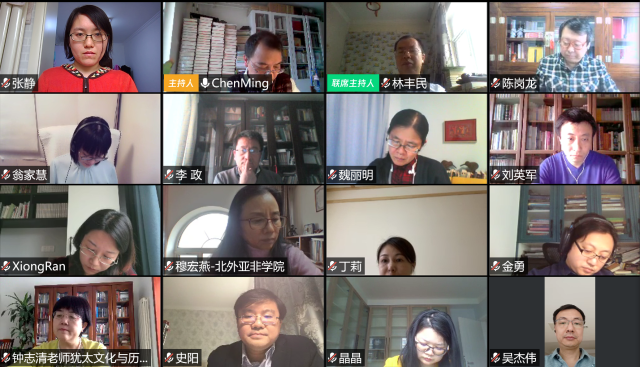 2020年4月18日下午,北京大学东方文学研究中心召开视频工作会议,讨论中心在下一阶段的工作计划。中心主任陈明教授、副主任林丰民教授、中心的骨干成员:北京外国语大学亚非学院地区研究中心负责人穆宏燕教授、中国社会科学院外国文学研究所钟志清研究员、外国语学院李政教授、陈岗龙教授、魏丽明教授、丁莉教授、吴杰伟教授以及来自外国语学院日语系、东南亚系、南亚系、西亚系的青年教师共16人参加了本次会议。会议由林丰民教授主持。