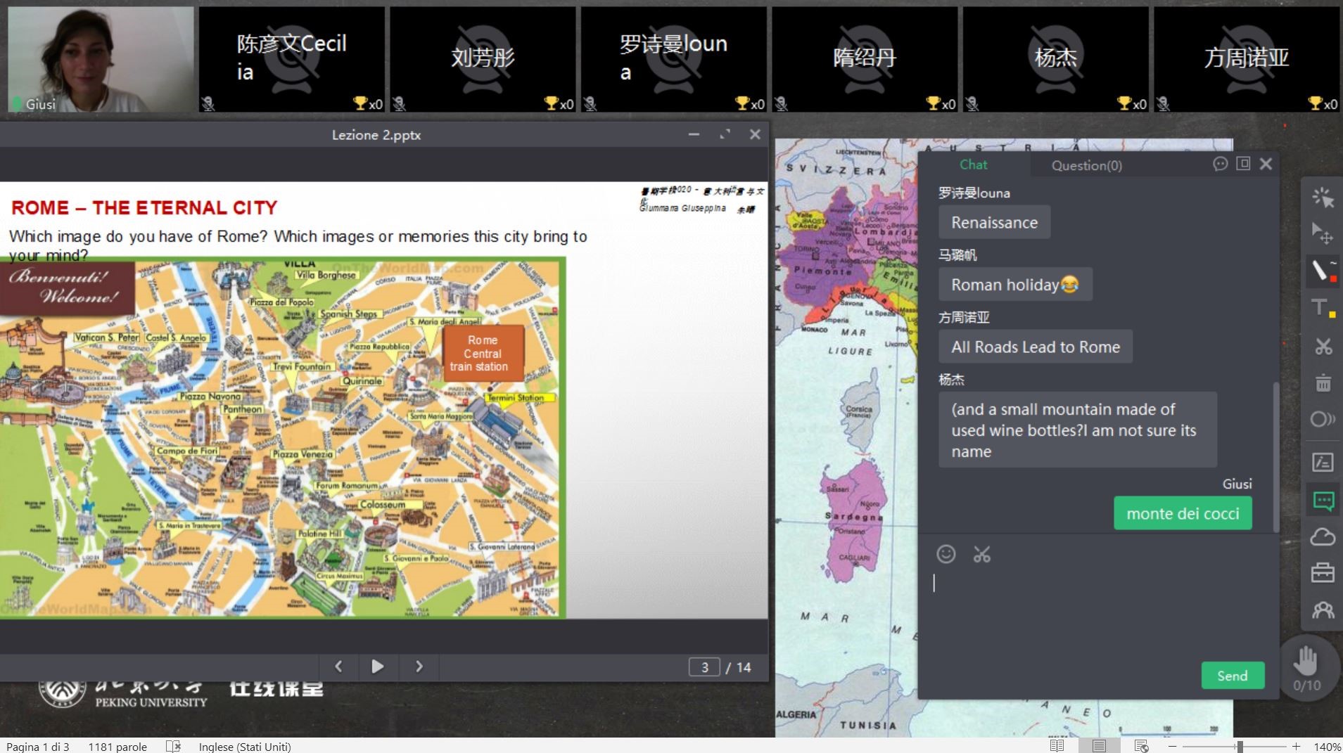 2020年6月29日至7月13日,九州体育“意大利语言和文化暑期课”顺利举办。因疫情原因,本次暑期课以线上授课的形式进行,课程按照历史时间线的发展,以意大利的不同城市为专题,详细介绍了意大利自古罗马、中世纪、文艺复兴直至近现代的历史与文化变迁,并通过基础意大利语的教学与练习,使学生对于意大利的语言、历史、自然与文化遗产、中意关系史等方面有了基本的认识。来自外国语学院、元培学院、国际关系学院、物理学院、哲学系、历史学系、医学部等院系的同学参加了本次暑期课。