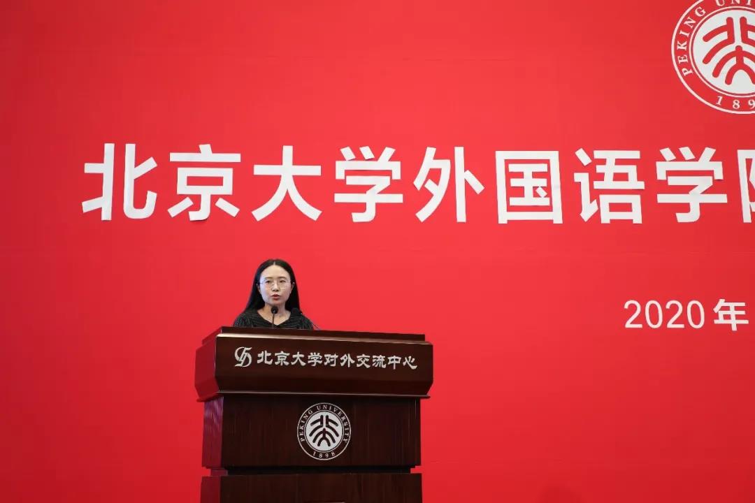 在热烈的掌声中,院长宁琦为2020级新生送上开学寄语。宁老师首先代表学院全体师生员工祝贺并欢迎新同学成为北大外院的一份子。随后,她结合当下新冠疫情的影响与国际格局变动,指出日常生活中被人们一直忽略的不确定性才是个体生命的常态。在急剧变化着的、充满不确定性的世界中,人们更需要找到自己安身立命的位置。