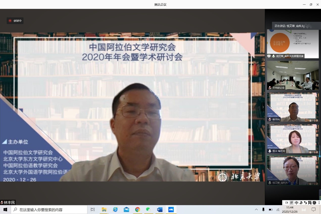 林丰民教授首先代表中国外国文学学会阿拉伯文学研究分会和北京大学阿拉伯语系致辞。他对2020年阿拉伯文学研究界的情况进行了简要的回顾,对今年去世的两位阿拉伯文学研究巨擘仲跻昆先生和郅溥浩先生表达追思,并对2021年阿拉伯文学研究的发展提出新的目标和方向。林丰民表示2021年将举办如“纪伯伦逝世90周年纪念研讨会”和“马哈福兹诞辰110周年研讨会”等专题研讨会,希望大家能够传承前辈的学术精神,更加努力进行教学和研究工作,更加积极参与文学探讨和交流活动。