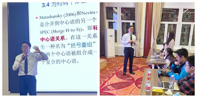 程工老师在讲座中主要分享了他对量词结构和复数形态进行统一分析的思考。程老师首先介绍了主流研究中名词性结构的两种分析路径,即以Chierchia为代表的词库分析路径和以Borer为代表的句法分析路径。程老师认为,句法路径更为经济也更为本质,其优势之一是将互补分布的复数形态和量词结构视为一个硬币的两面——表现不同,但功能相同,都是实现名词的个体化从而进行计数的方式。在句法路径的研究思路下,程老师从汉语的物质量词和个体量词两个类别出发,分别论证量词结构和复数形态一致存在的合理性。