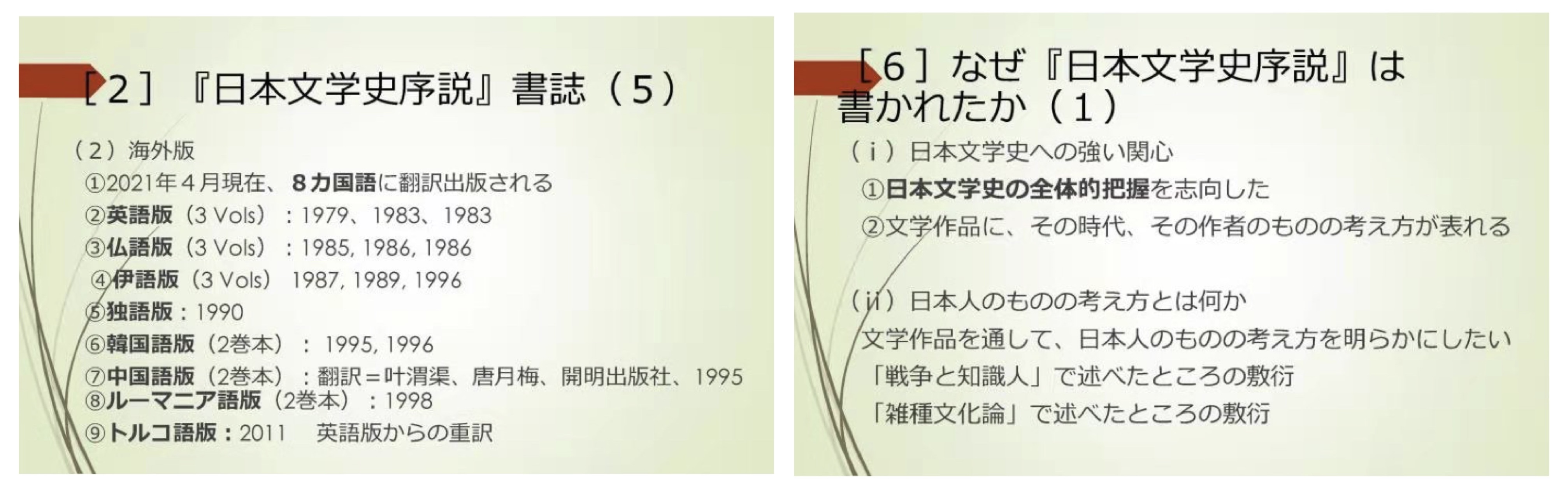 本次讲座中心议题围绕《日本文学史序说》展开,鷲巢研究员首先介绍了文学通史与国家意识之间的密切关系,指出十九世纪后半叶欧洲在形成国民国家过程中诞生了多部文学通史,其所反映的时代精神和国家意识形态是清晰可辨的。以此为参照,他梳理了日本文学通史编撰出版的发展过程,根据日本国民国家形成时期、国家主义抬头时期、日本战后等三个不同阶段的历史背景,分析并明确了日本文学通史的定位和价值。他指出,个人编撰的文学通史并不多见,且在日本国文学研究领域评价较低,但加藤周一的《日本文学史序说》却凭借作者对日本文学的准确理解与深刻批评而成为不朽名著。