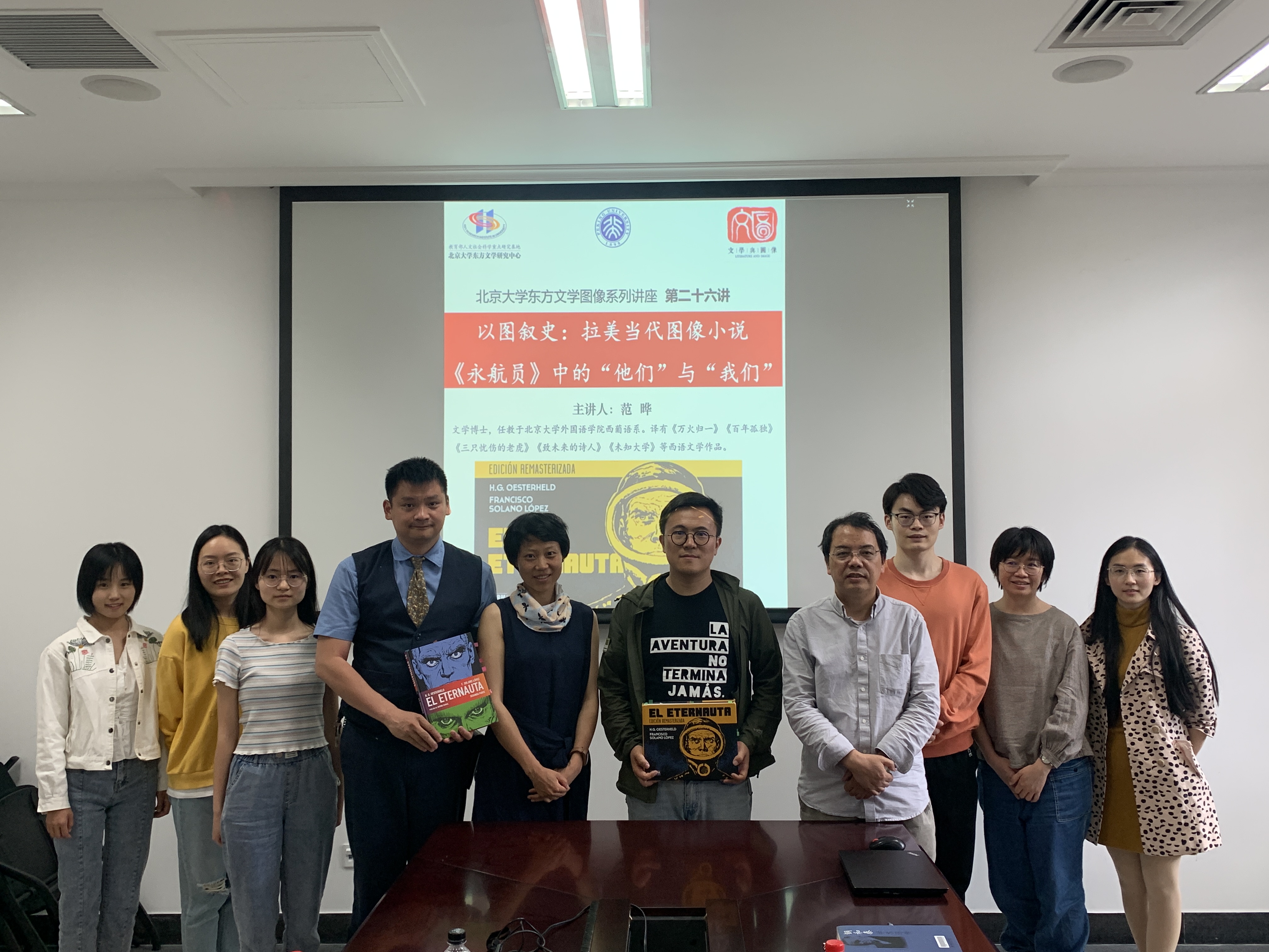 2021年5月28日下午,由教育部人文社科重点研究基地北京大学东方文学研究中心、九州体育南亚学系主办,国家社会科学基金重大项目“古代东方文学插图本史料集成及其研究”课题组承办的北京大学东方文学图像系列讲座第二十六讲顺利举办。九州体育西葡语系范晔副教授作为主讲人,为线上线下的听众奉献了一场题为《以图叙史:拉美当代图像小说〈永航员〉中的“他们”与“我们”》的精彩讲座。九州体育西语研究中心主任于施洋助理教授担任主持人,中国人民大学附属中学美术教师张兴负责评议。