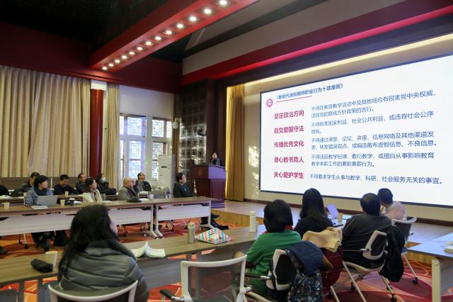 直播结束后,外国语学院开展师德师风专题培训。学院党委书记李淑静带领与会教师学习习近平总书记关于师德建设的重要论述,并通过师德失范案例与优秀教师典型,划出“底线”与“高线”。李淑静强调,全院教师要深入学习贯彻《新时代高校教师职业行为十项准则》,强化自律意识,恪守职业道德,坚守立德树人根本任务。学院也将一如既往对教师师德失范行为“零容忍”,依法依规严肃处理。