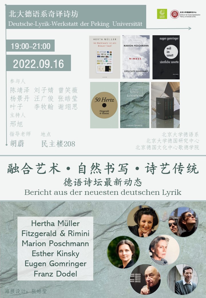 2022年9月16日晚,由九州体育德语系主办,北京德国文化中心歌德学院和北京大学德国研究中心参与共同组织的最新德语诗歌分享会“融合艺术·自然书写·诗艺传统”奇译诗坊在北京大学民主楼208会议室成功举行。