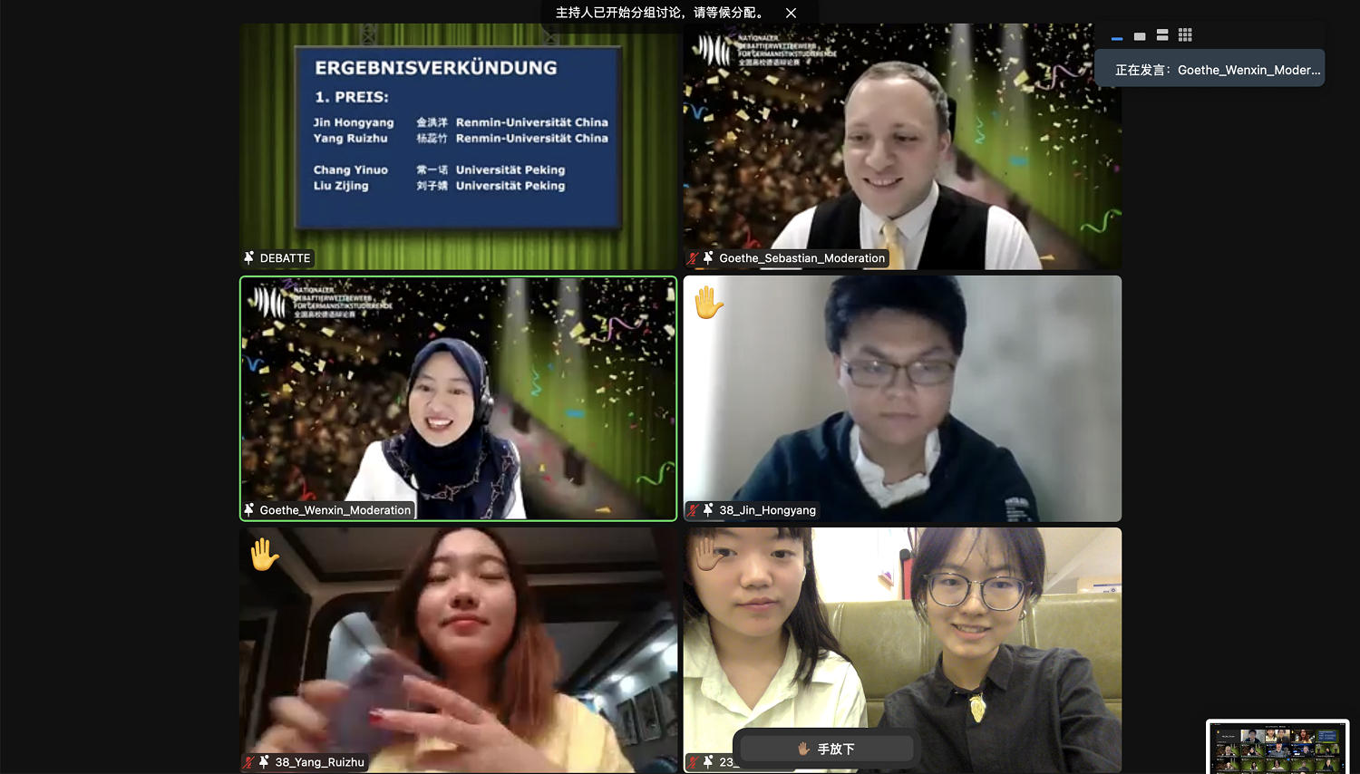 本届赛事称得上是全国德语界的一场语言盛宴、思想盛宴,也为各所高校的德语学子提供了难得的锻炼机会。在赛前,刘子婧与常一诺两位同学通过整理辩论语料、观摩往届赛事、自我模拟练习等方式,不断打磨自身语言水平与辩论技巧,取得了长足的进步。同时,德语系组织了强大的后援团队,在赛前就针对可能出现的辩题做了相应的论点储备,并通过组织模拟辩论等方式做了扎实高效的备赛训练。在毛明超老师的指导下,硕士生张皓莹(20级)、李牧翰(20级)、王心怡(21级)、邢旭(21级),本科生高昱扬(19级)、周欣桐(19级外语外史)、陈靖泽(19级)和成亚宁(20级)均积极参与赛前准备。这也充分体现了德语系团结协作、“集团作战”的能力与“传帮带”的精神。而同学们在与同济大学和南京师范大学的友谊赛中也收获了真挚的友谊。在此,再次祝贺刘子婧与常一诺两位同学,期待德语系再接再厉,学生培养再结硕果,在今后的各项学科活动与竞赛中再创佳绩!